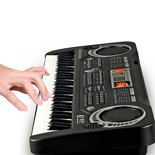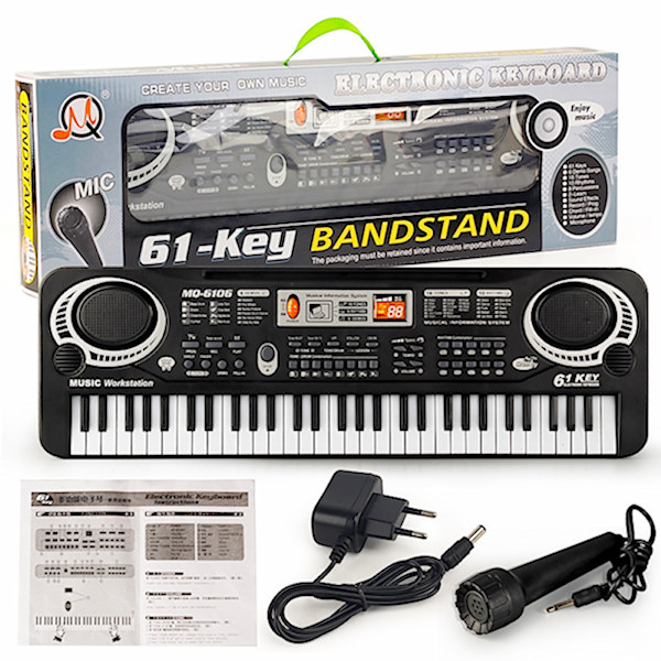 Синтисајзер са 61 тастером, микрофоном и адаптером за повезивање на електричну мрежу.